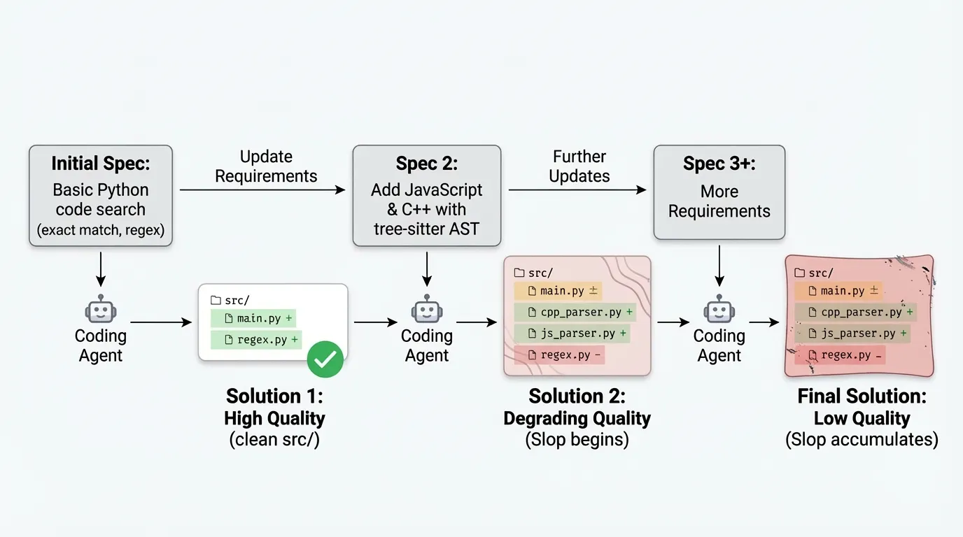 Rather than attempting to assign a single notion of “code quality,” we examine two surface properties of agent-generated code under iteration: verbosity, characterized by overly defensive code and redundant anti-patterns, and structural erosion, characterized by organizational strain such as control-flow complexity and brittle structure. We use “slop” informally to refer to surface-level verbosity and structural patterns, without implying a judgment of overall code quality. This approach has produced some exciting preliminary findings: In our experiments, progress through iterative specifications is often associated with increased verbosity, while advancement is constrained when structural erosion accumulates. These dimensions move in different, sometimes opposing, directions, revealing trade-offs that are invisible in single-shot evaluations.